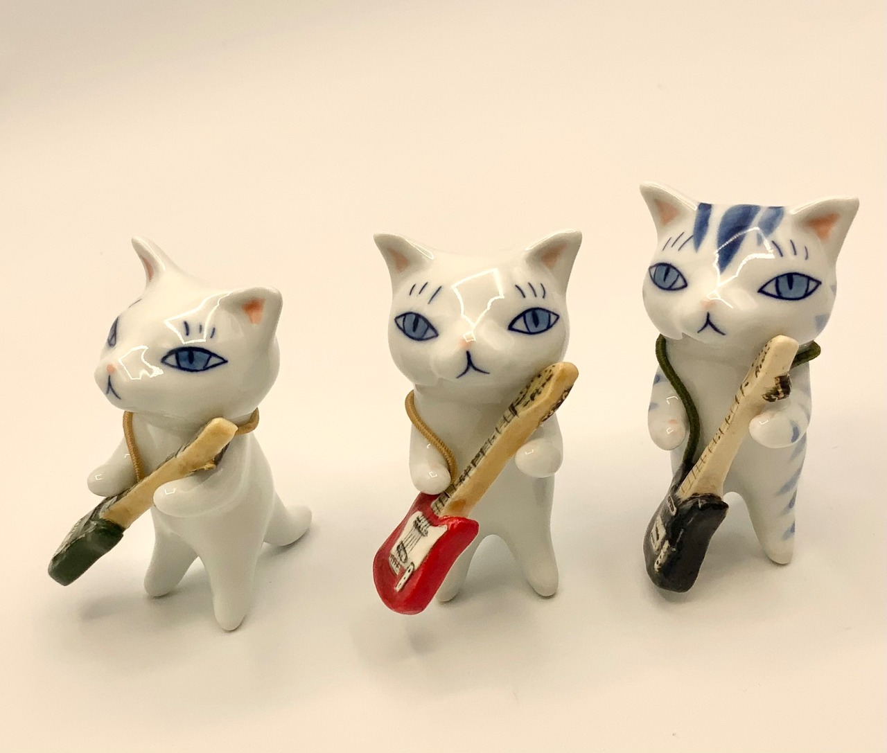 磁器で作ったギターにゴムをつけているので猫に持たせて飾ってください。ゴムを強く引っ張ると外れる恐れがあります。(もしゴムが外れてしまった場合は大変申し訳ありません!ご自分でボンドで接着してください。)