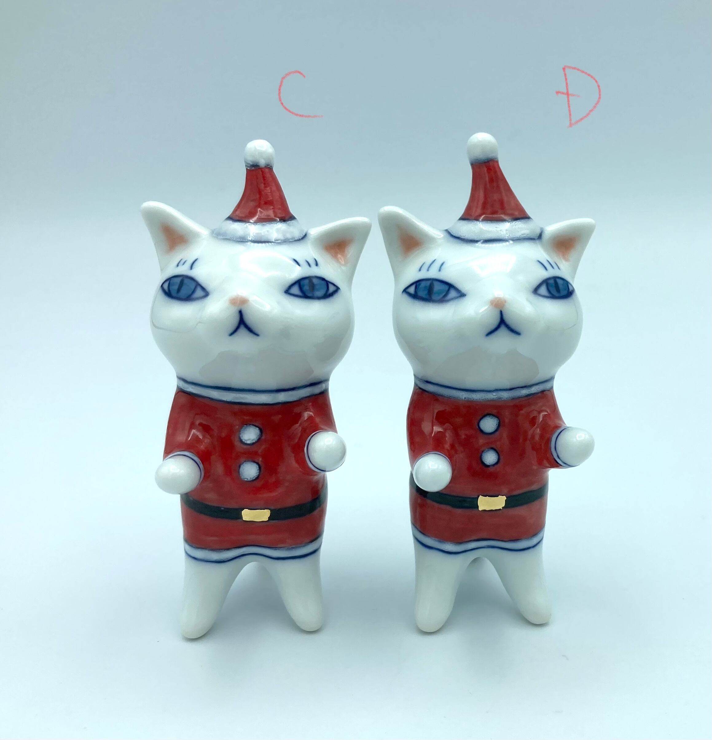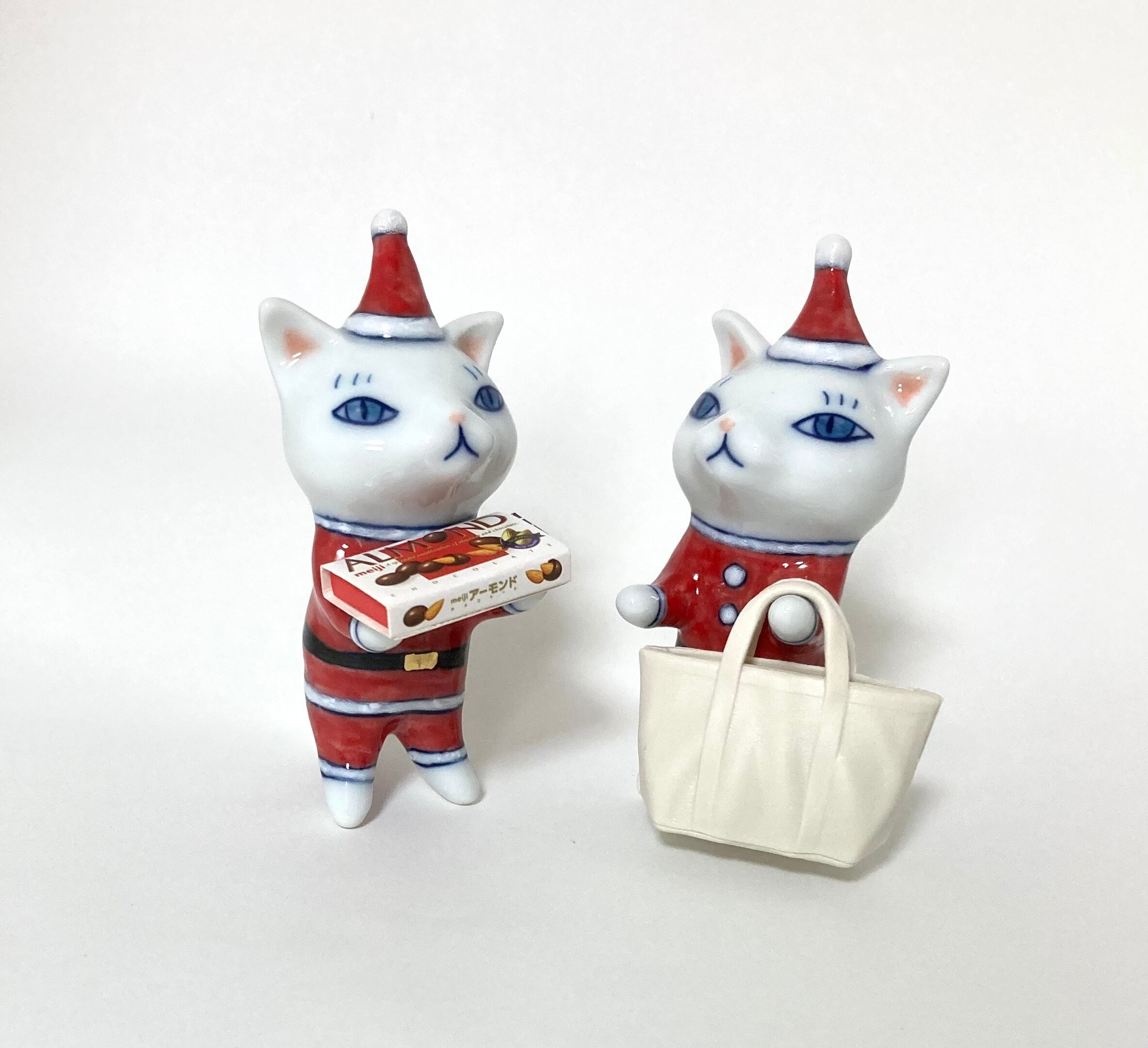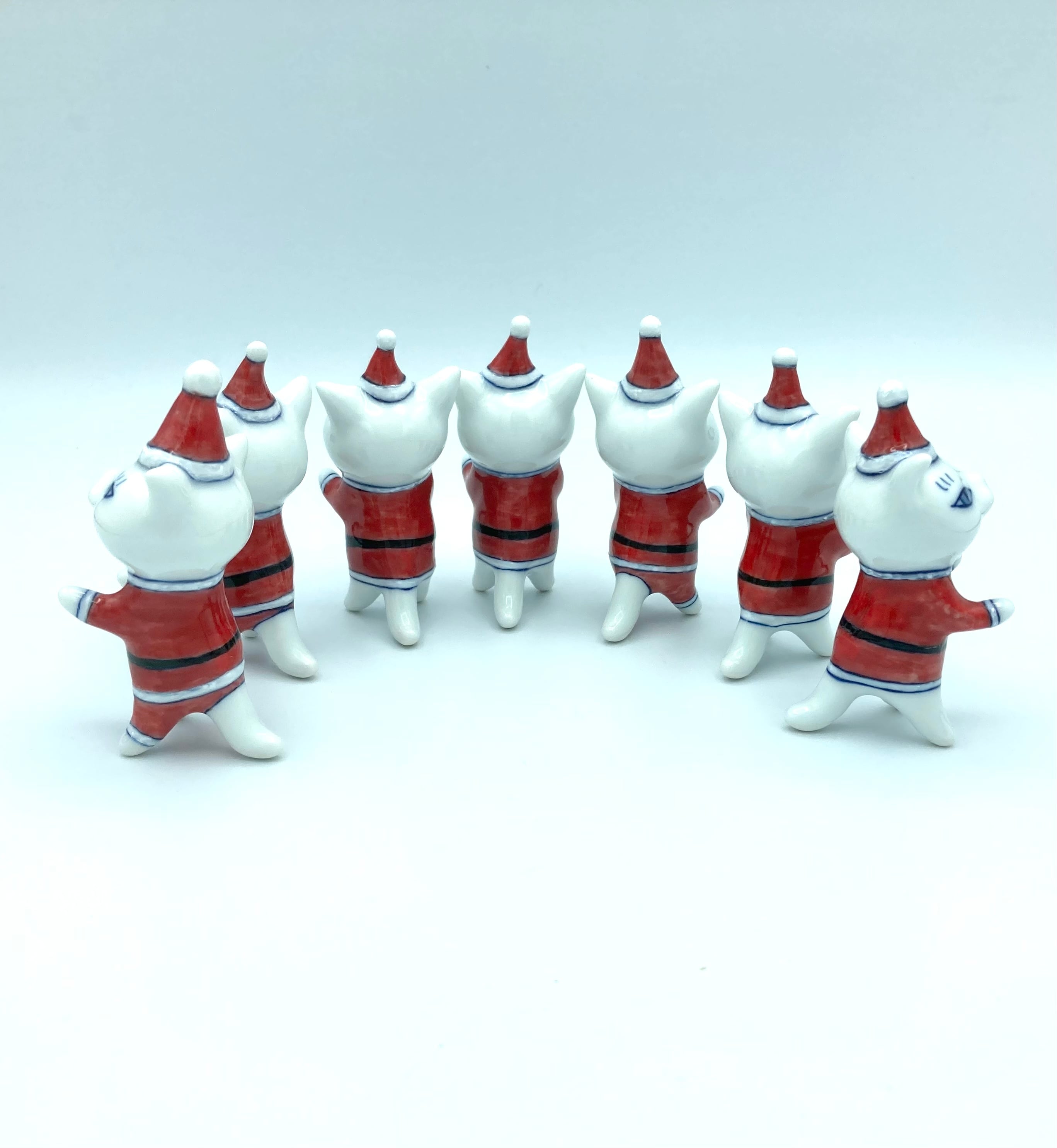 磁土、排泥鋳込みで作っています。帽子の形など手作業で作ってますので形が微妙に違います。もちろん1匹ずつ手描きで描いてますので、顔つき、服も微妙に違います。写真と現物が印象が違うと思われるかもしれません。拡大してじっくりお選びください。