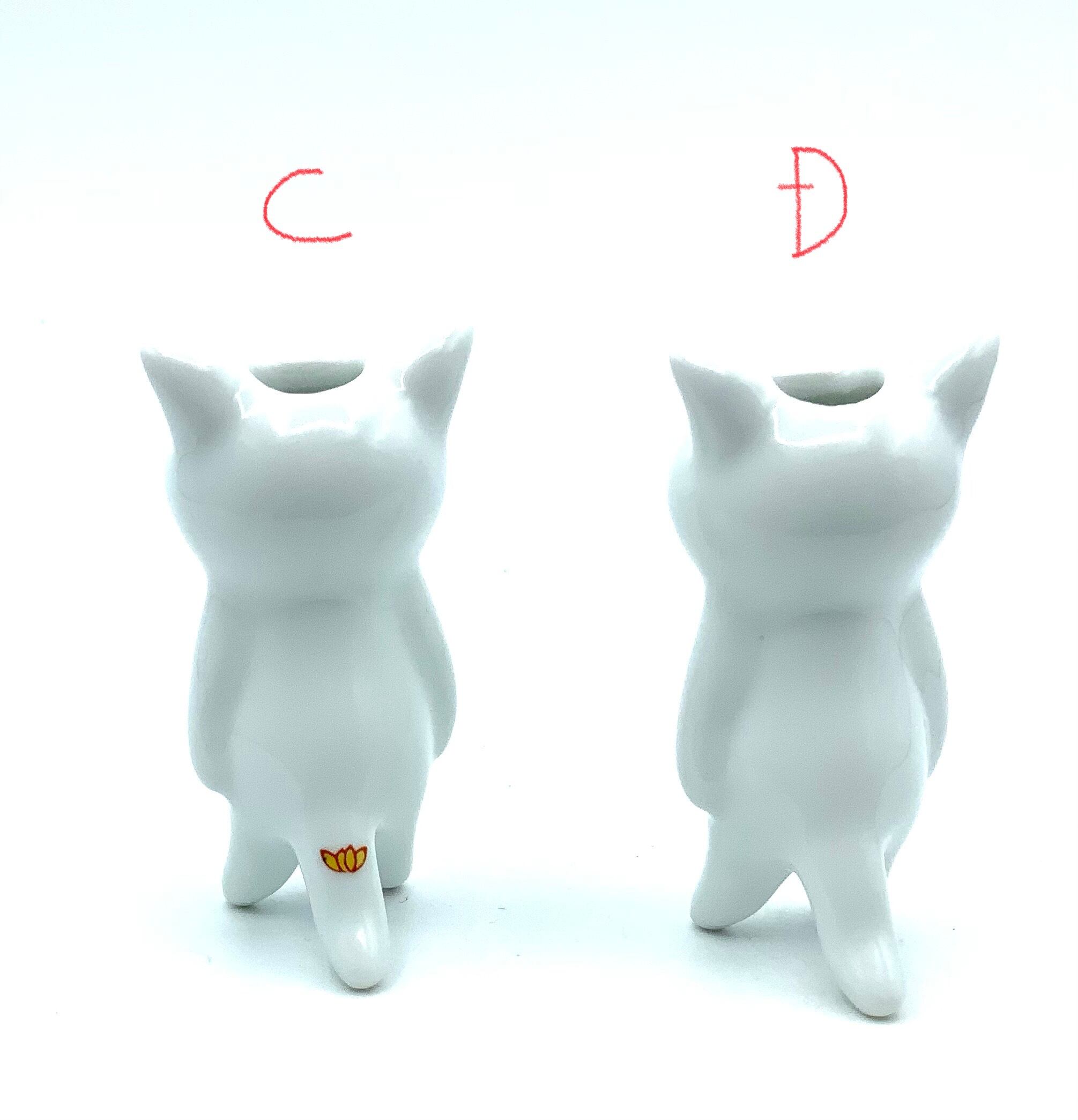 通常の白猫がベースです。転写シートをコラージュ貼り付けて上絵焼きしています。剥がれることはありません。磁土、排泥鋳込みで作っています。(原材料、焼成代金などの値上がりの為、価格が前回より上がっております。ご了承いただけると助かります!)