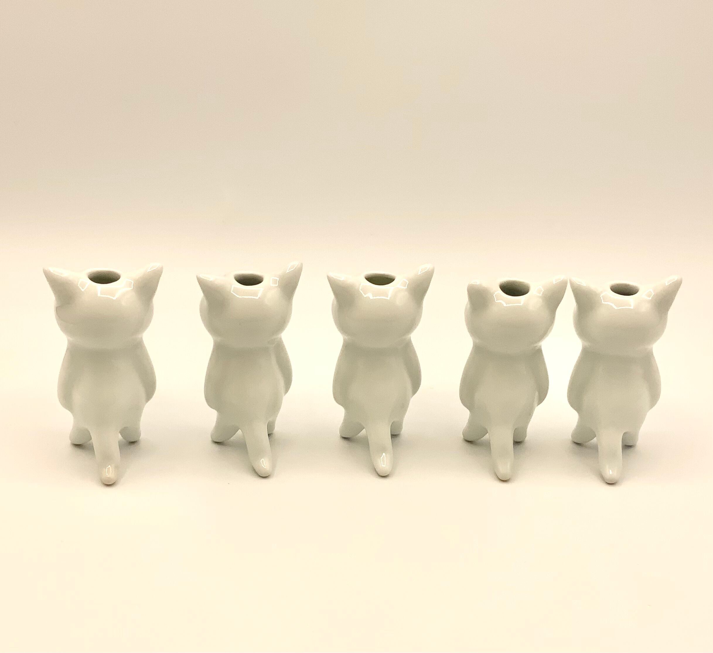 磁土、排泥鋳込みで作っています。体型はほぼ同じです。水漏れしませんのでお花を生けられます。爪楊枝入れとしても使えます。