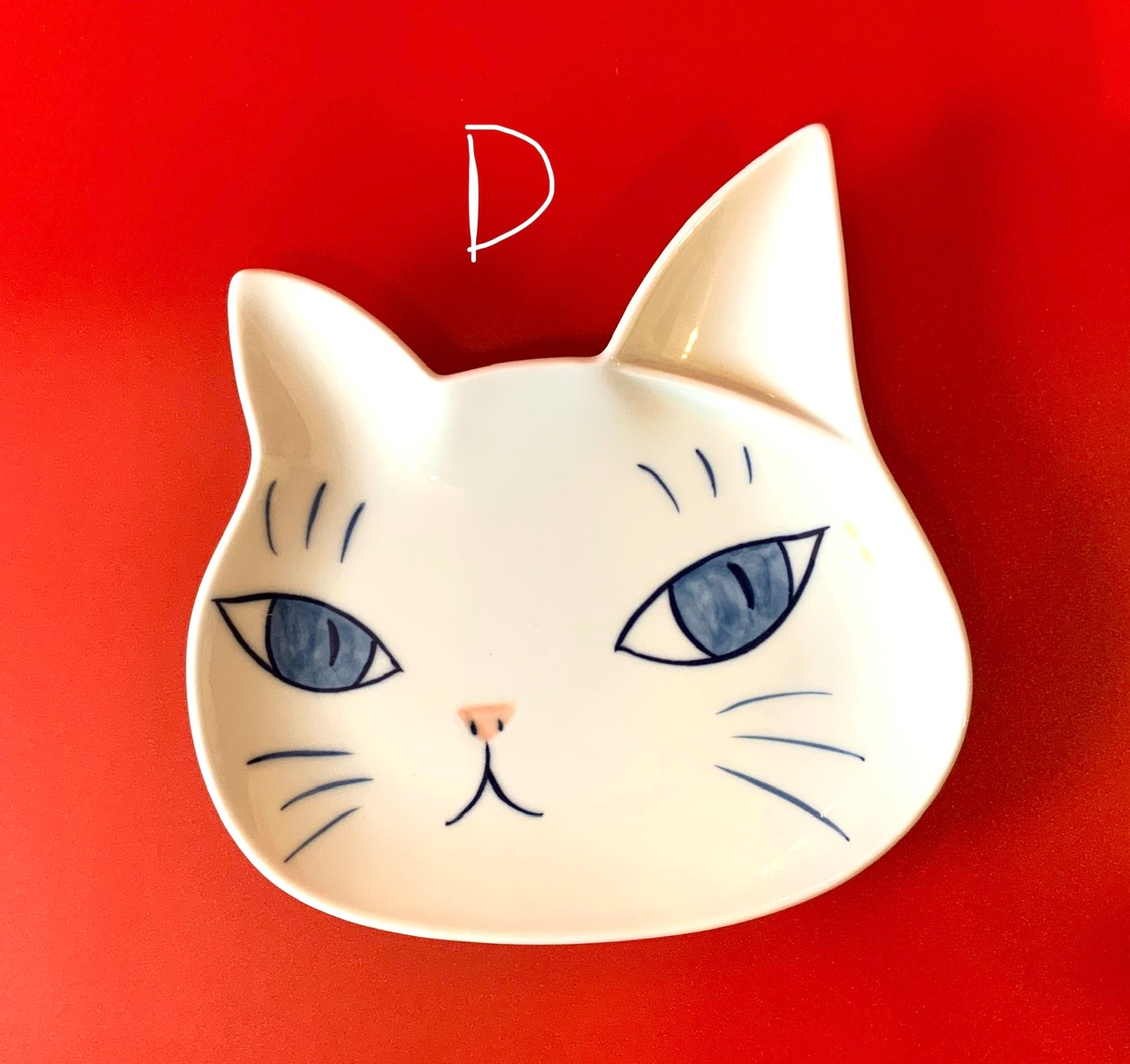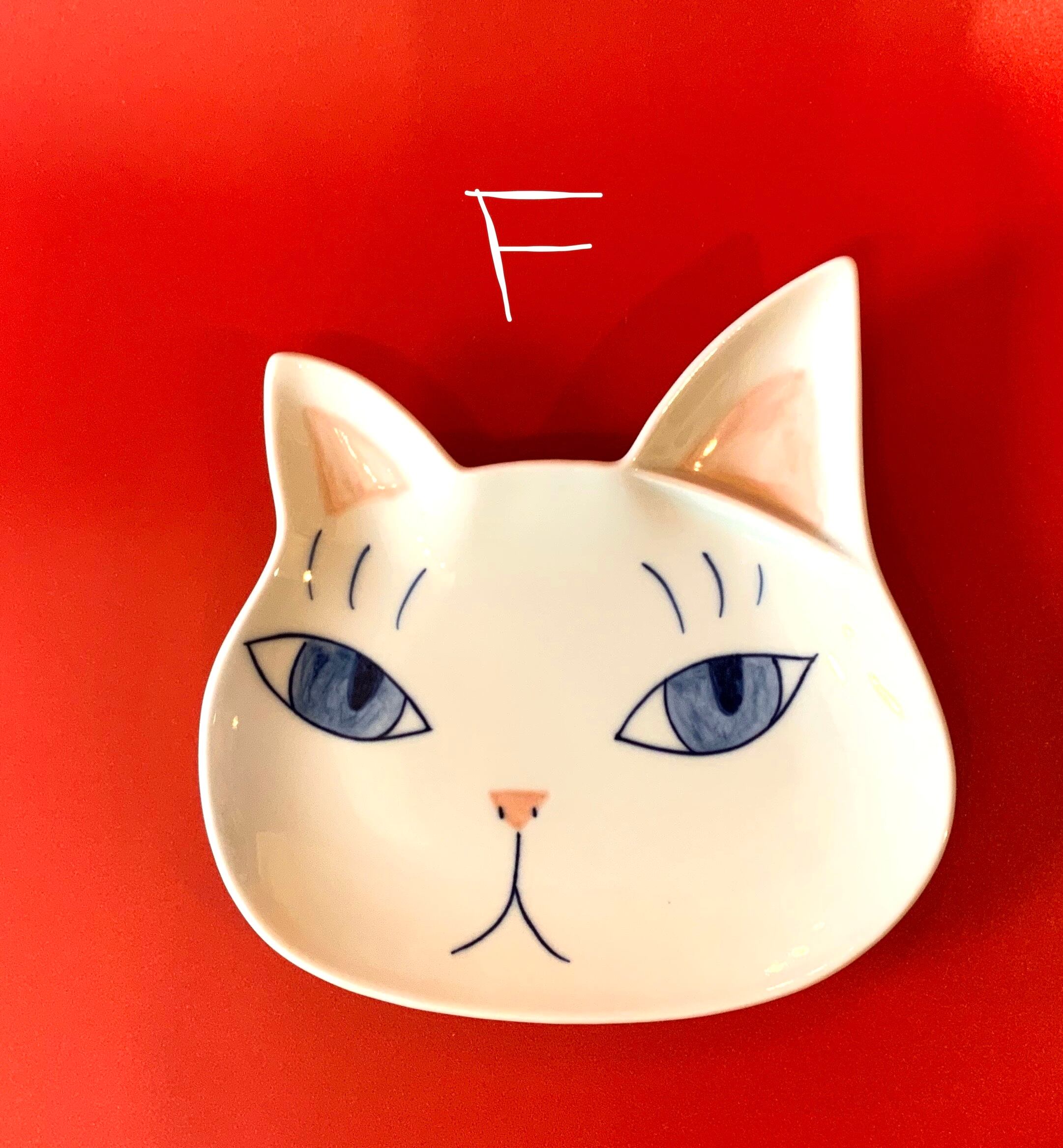 フラワーズのオリジナル猫の特徴であるアシンメトリーな形のデザインの猫顔皿です。